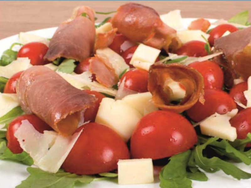 Σαλάτα με ρόκα, ντοματίνια, παρμεζάνα, προσούτο & μοτσαρέλα