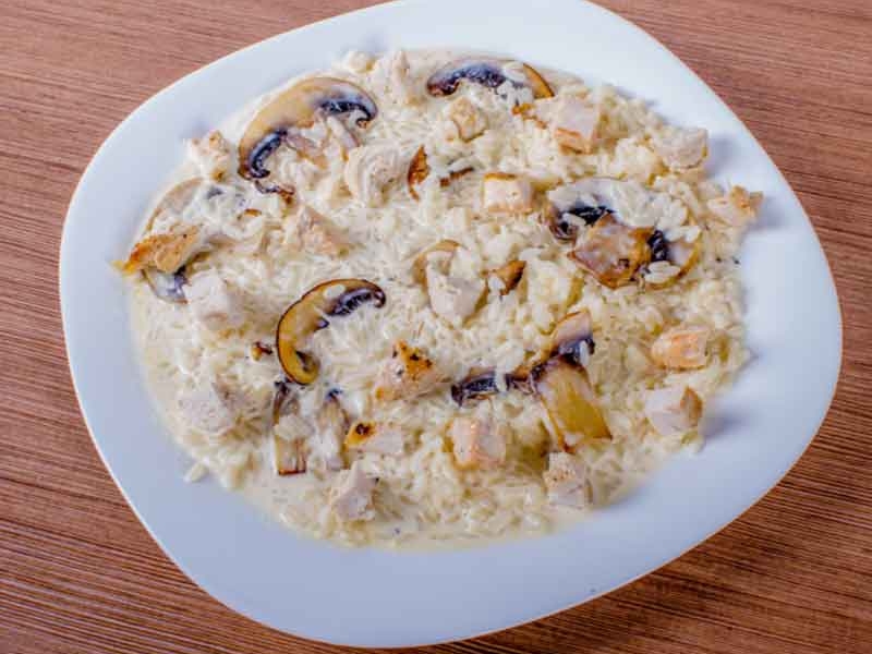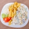 Με κρέμα γάλακτος & μανιτάρια. Συνοδεύεται από πατάτες τηγανητές, ρύζι, λαχανικά (ντομάτα, αγγούρι, κρεμμύδι & πιπεριά πράσινη) & ψωμί