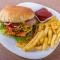Με μπιφτέκι λαχανικών, ντομάτα, μαρούλι & ketchup. Συνοδεύεται από πατάτες τηγανητές
